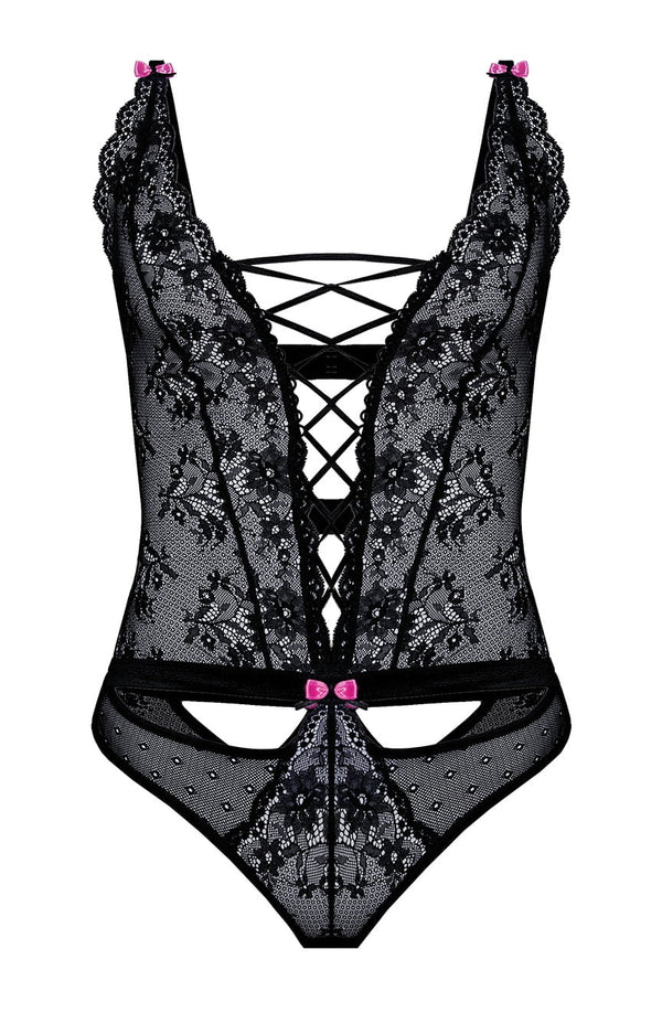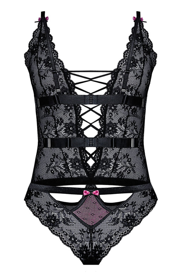 Fifii body is made of lovely soft all over lace fabric with contrasting pink satin bows. The open front has an elasticated Criss cross design. The back has two satin finish elasticated straps which are adjustable and also fasten with a hook and eye closure. The back of the brief has a matching satin finish elasticated top with pink satin bow and pink diamond shape overlaid with black lace. shoulder straps are also adjustable. A lovely design. Arrives boxed.
