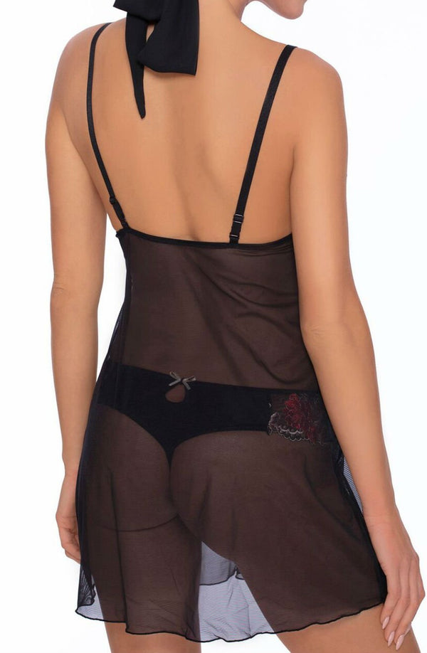 A beautiful chemise from Roza Natali has stunning detailed flower and leaf embroidery on the front with beautiful scalloped edges on the cups. The shoulder straps are elasticated and adjustable for comfort and fit. The cups are none underwired and there is a lovely v shaped cut out detail at the front which is laced with fine satin ribbon. The main body of Natali is made from soft semi transparent tulle. The back has a small embroidered flower motif on the tulle between the shoulder straps. The rest of the back is in plain matching black tulle. The matching thong or brief are not included but are available separately. This item arrives packaged in a lovely Roza box.