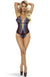 A soft lace crotchless body made in sapphire blue and black lace. Halter neck tie peep hole cups with ribbon tie detail. The back has stunning lace detail. A quality Provocative product which arrives packaged in her own box.